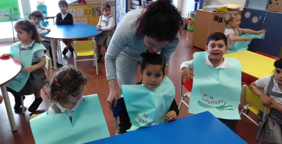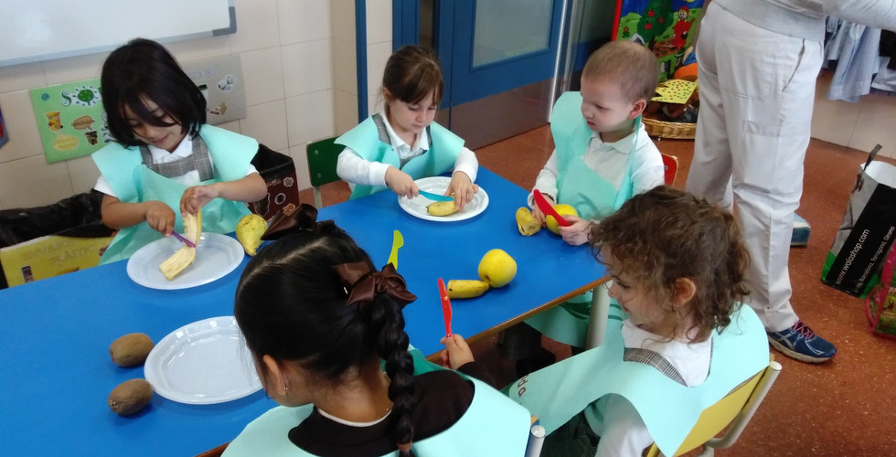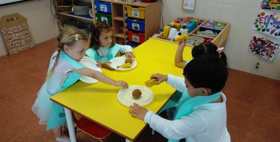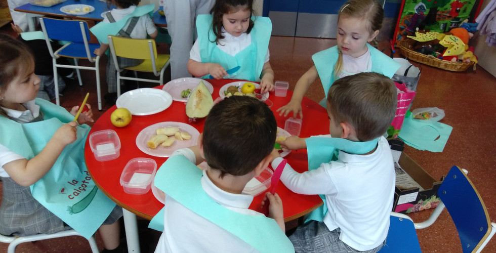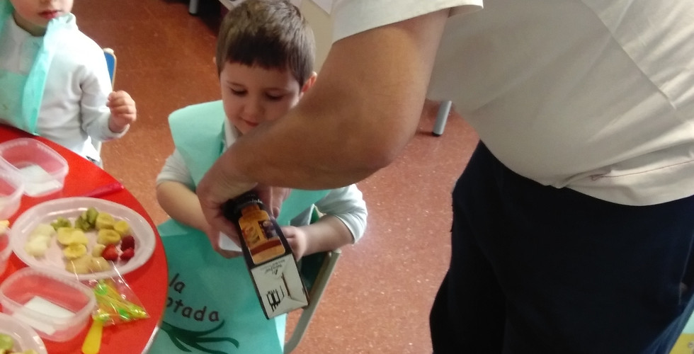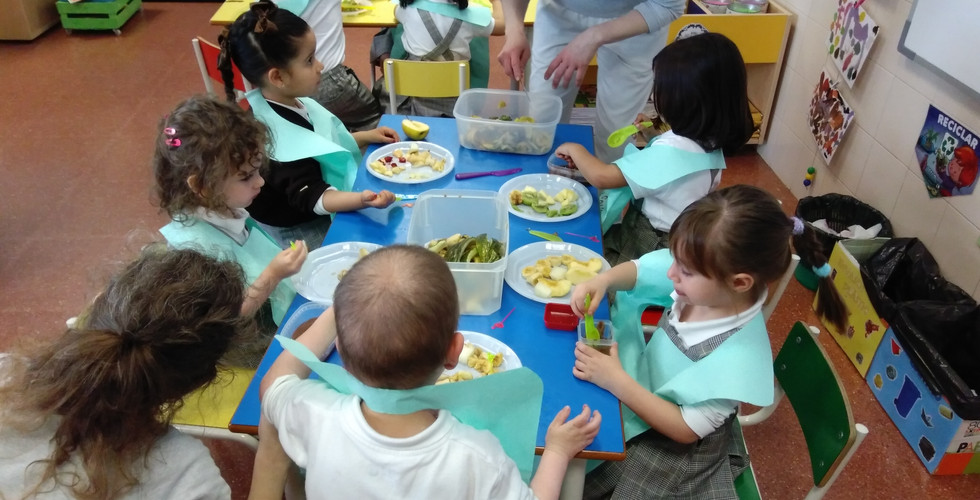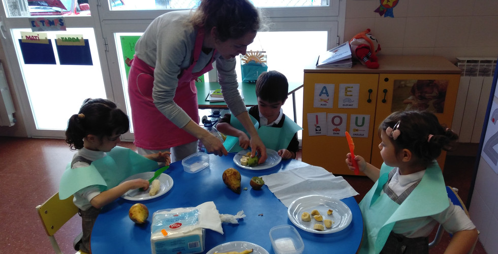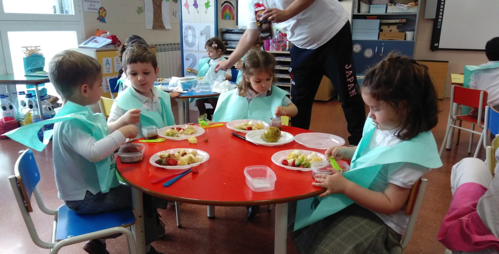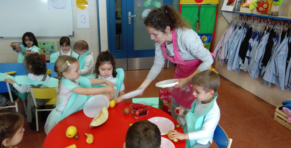 Un tarda, la seva mare i la seva tieta van venir a l’escola per fer una activitat amb fruita! Primer de tot, ens van repartir uns pitets enormes perquè no ens embrutéssim. Després, ens van donar fruita i ganivets perquè la poguéssim tallar a trossets. Hi havia poma, pera, maduixes... Què bona estava la fruita!