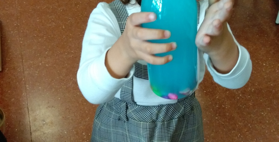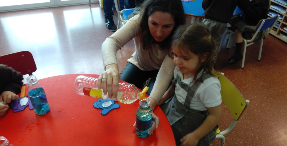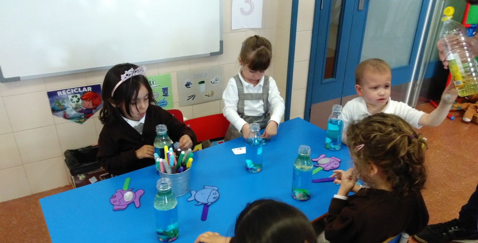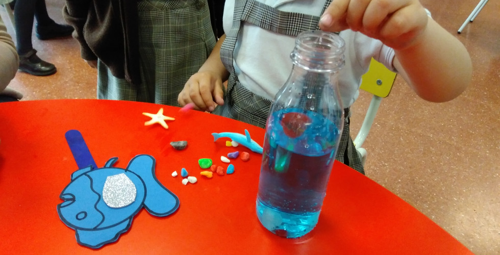 Tot seguit, ens van repartir una ampolla transparent i vam fer un fons marí! Primer vam posar aigua, després li vam afegir colorant perquè es tornès de color blau. I hi vam afegir una mica d’oli, peixets, pedretes i petxines. Que bonic que va quedar!!!!